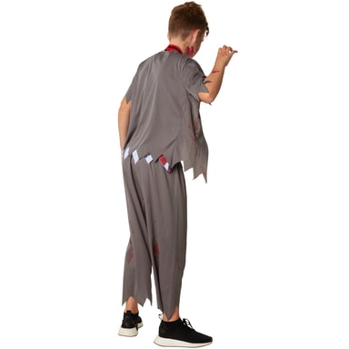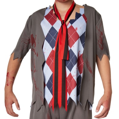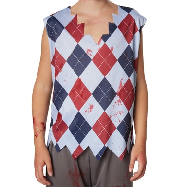 Kostumet, skræmmende skoledreng, har frynser på alle dele og er blodplettet. Helt perfekt til Halloween. De lange bukser er hullede og har en elastiklinning. Den ærmeløse overdel er holdt i slipover-look, ud over bæres en vest. Et langstribet slips fuldender kostumet, materiale: 100 % polyester.