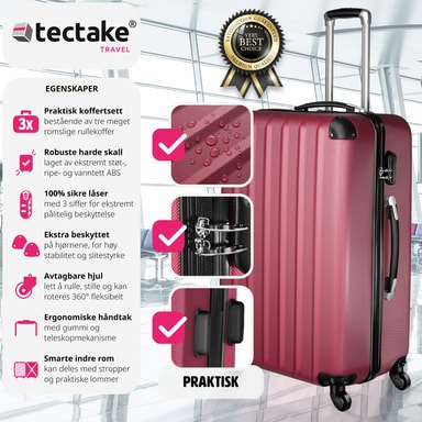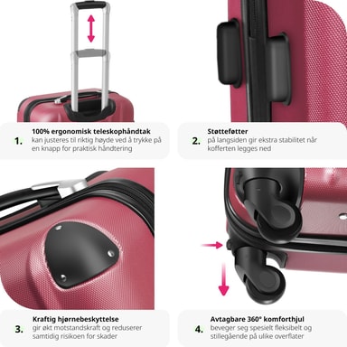 Dette kuffertsæt hardcase er fremstillet af let ABS-materiale, som giver et elegant metal-look, der både er holdbart og let. Dette betyder, at du kan stole på, at din bagage er beskyttet mod stød og skrammer, mens du stadig har en kuffert, der ser moderne og stilfuld ud. ABS-hardcase designet sikrer, at din bagage forbliver intakt, selv under de mest krævende rejseforhold.