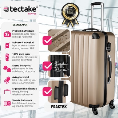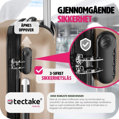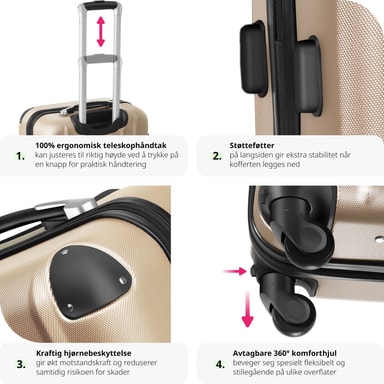 Dette kuffertsæt hardcase er fremstillet af let ABS-materiale, som giver et elegant metal-look, der både er holdbart og let. Dette betyder, at du kan stole på, at din bagage er beskyttet mod stød og skrammer, mens du stadig har en kuffert, der ser moderne og stilfuld ud. ABS-hardcase designet sikrer, at din bagage forbliver intakt, selv under de mest krævende rejseforhold.