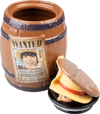 Denne Grupo Erik One Piece Netflix Wanted småkagekrukke er officielt licenseret køkkentilbehør lavet af dolomit og resin. Den har et ikonisk Luffy Wanted plakat-design på en tøndeform og inkluderer en forsegling, der holder dine småkager sprøde.Læs mere om produktet