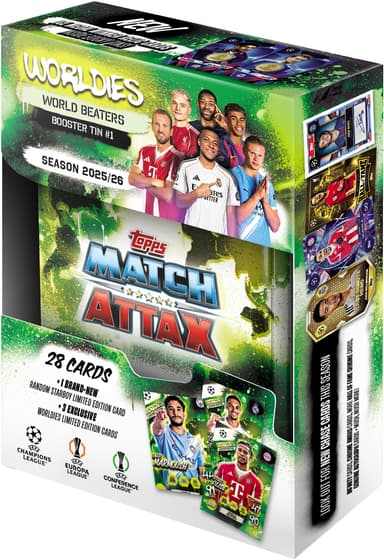 Topps Match Attax Champions League 2025/26 Booster indeholder 28 kort pr. æske, med sæt som International Icons, Global Goalscorers, Homegrown Heroes eller World Beaters. Hver æske har 3 eksklusive kort i begrænset oplag.Læs mere om produktet