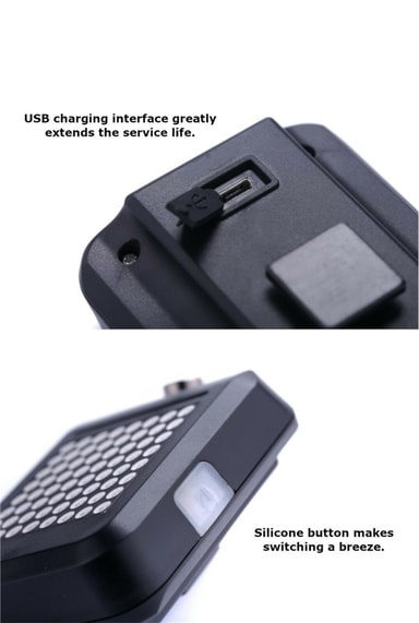 Litium-ion-batteriet på 1200 mAh er fuldt opladet efter 3,5 timers opladning via USB-forbindelse og er kompatibelt med de fleste telefonopladere, powerbanks, laptops og computere. Den leveres med en justerbar silikongummirem, som kan fastgøres til de fleste cykler. Specifikationer: