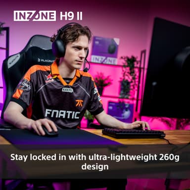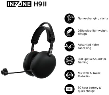 Dette Sony Inzone H9 II trådløse gaming headset er udstyret med 30 mm drivere, en letvægtskonstruktion på 260 g, tre tilslutningsmuligheder, avanceret aktiv støjreduktion, 360 Spatial Sound og 30 timers batteritid.Læs mere om produktet