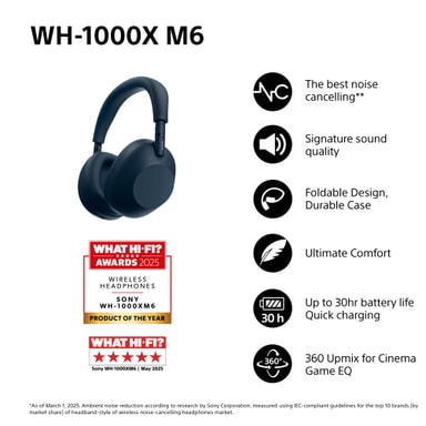Sony WH-1000XM6 trådløse høretelefoner med støjreduktion – fås i farverne Black, Silver og Midnight Blue