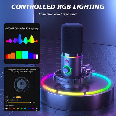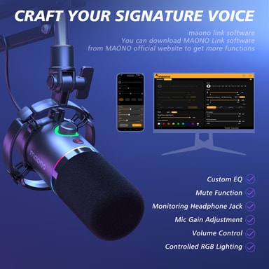 Denne mikrofon bruger MAONO Link-softwaren til at låse op for avanceret lydbehandling. Denne software giver brugerne mulighed for at justere Equalizeren, indstille en Compressor for volumenkonsistens og konfigurere en Limiter for at forhindre clipping samt tilpasse RGB-belysningseffekterne.