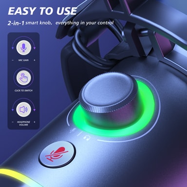 Mikrofonen giver øjeblikkelig kontrol med en dedikeret 2-i-1 smart knap til volumen- eller forstærkningskontrol for at justere mikrofonfølsomheden direkte. Den inkluderer en øjeblikkelig Tap-to-Mute-sensor med LED-indikator til hurtig lydløs og kontroller til at skifte eller tilpasse RGB-lysningstilstandene.