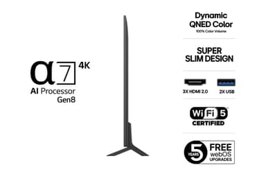 QNED80 kombinerer α7 Gen 8 4K AI-processor og QNED evo Colour for levende farver og stærk kontrast. Avanceret Local Dimming og HDR10 Pro optimerer hver scene, mens det slanke 29 mm design med justerbar fod passer perfekt i ethvert rum.Læs mere om produktet