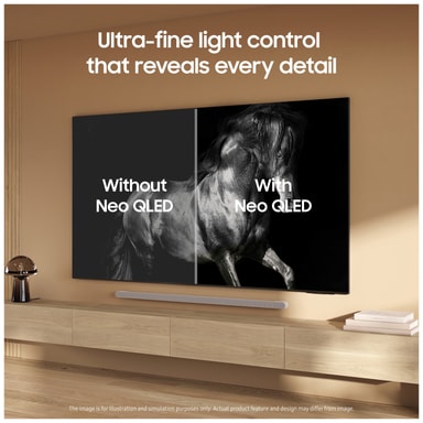 Neo QLED med Mini-LED-teknologi giver større kraft og præcision i lys og farver. AI-processor til billedbehandling og hurtige 144Hz HDMI-indgange til gaming.