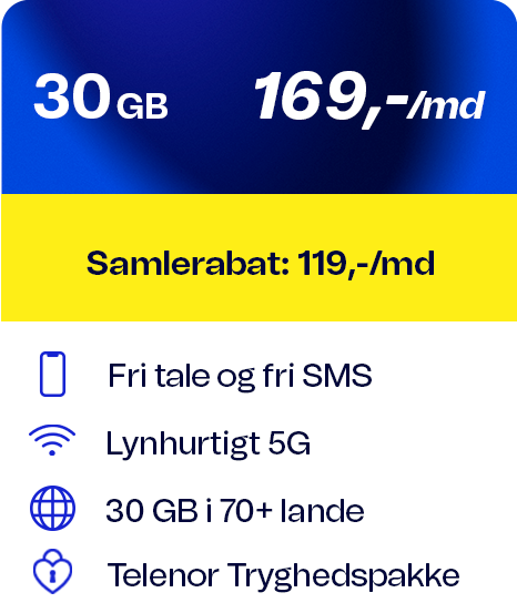 Tilbuddet gælder med abonnementer 30GB. 120GB og Fri Data fra Telenor.