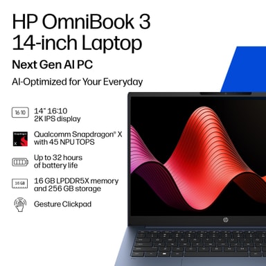 HP OmniBook 3 NG 14" AI X1/16/256/IPS Copilot+ PC kombinerer Snapdragon X-ydeevne med en skarp Full HD IPS-skærm, der hjælper dig med at være produktiv i længere tid med sin pålidelige batterilevetid.Læs mere om produktet