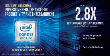 Dual-core Intel Core i3 processoren fra Coffee Lake familien, sikrer en problemfri ydelse, selv når du bruger flere avancerede programmer på samme tid. Og så understøttes processoren af 4 GB hurtige DDR4 RAM og en integreret Intel UHD Graphics 630 chip.