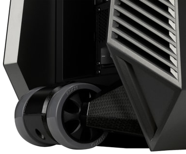 Det sorte og sølvfarvede kabinet har justerbar RGB-belysning og et robust gennemsigtigt sidevindue, der viser den imponerende indvendige opsætning. Ice Tunnel 2.0 teknologien opdeler kabinettet i adskillige termiske zoner, for at sikre at den varme luft fjernes så effektivt som muligt, mens gitterpanelerne leverer kold luft udefra. Takket være det værktøjsfrie sidepanel har du nem adgang til at opgradere komponenterne. De 2 tophåndtag og hjulene i bagenden gør det nemt at flytte den stationære computer. Og holderen til dit headset er en praktisk tilføjelse.