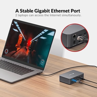 Denne switch giver dig mulighed for at bygge en kraftfuld arbejdsstation derhjemme med to USB-C MST-computere. Ud over to skærme kan dine to computere dele USB-enheder såsom mus, tastatur, webcam, printer, men også SD-kort.Læs mere om produktet
