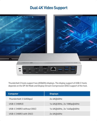 Cable Matters 14-ports Thunderbolt 3-dockingstation konverterer en Thunderbolt 3-port i din computer til 2x HDMI eller Displayport, 1x RJ45 Lan, 5x USB-A 3.0, 1x SD-kortslot, 1x MicroSD-kortslot, 1x USB-C 3.2 Gen 2, 1x USB-A 3.2 Gen 2 og 1x 3,5 mm AUX. Dockingstationen understøtter to eksterne skærme i opløsninger op til 4k60Hz via enten Displayport eller HDMI, og begge kan udvide og spejle computerens skrivebord (Kun Intel Macs understøtter to skærme). USB 3.2 Gen 2-portene understøtter dataoverførselshastigheder på op til 10 Gbps, og USB 3.0-portene understøtter dataoverførselshastigheder op til 5 Gbps. Det er muligt at tilslutte computeren til kablet internet via RJ45-porten som understøtter gigabit ethernet. Både SD- og MicroSD-kortpladserne understøtter 300 MBps dataoverførsel, og 3,5 mm AUX-porten kan bruges til både hovedtelefoner og en mikrofon. Dockingstationen kræver ingen drivere, og den kan også låses med en Kensington-lås.Specifikationer: