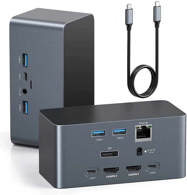Displayport eller HDMI Port1 kan håndtere 4K 60Hz, hvis din computer understøtter DP1.4, og du kun tilslutter én skærm til docken. HDMI Port 2 kan klare 4K30Hz, hvis din computer understøtter DP1.2. Begge HDMI-porte er bagudkompatible med 1080p, 1080i og 720P. Hvis du tilslutter to eller tre skærme på samme tid, vil opløsningen være 4K 30Hz.