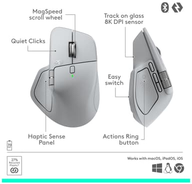Logitech MX Master 4 tilbyder tilpasselig haptisk feedback, Actions Ring-genveje, et ergonomisk design, pålidelig forbindelse og op til 70 dages batterilevetid.Læs mere om produktet