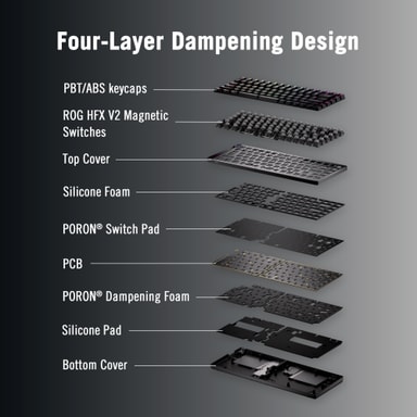 Hot-swappable ROG HFX V2 magnetiske switches tilbyder ultrapræcise tastetryk med justerbar aktivering fra 0,1-3,5mm og 0,01mm-trins justering, som giver forfinet respons og gaming-kontrol.