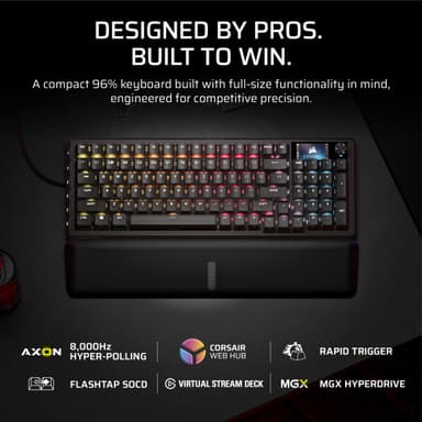 Corsair Vanguard Pro 96 tastaturet er en alsidig og kraftfuld mulighed, som har MGX Hyperdrive Hall Effect-swithces, USB-C tilslutning, en specialdesignet LCD-skærm, 8k polling-hastighed, Rapid Trigger Technology og RGB-belysning for hver tast.Læs mere om produktet