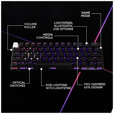 Logitech G Pro X 60 gamingtastaturet har optiske taktile taster, tre typer tilslutning, RGB-belysning, fuldt programmerbart knaplayout og 65 timers batterilevetid.Læs mere om produktet