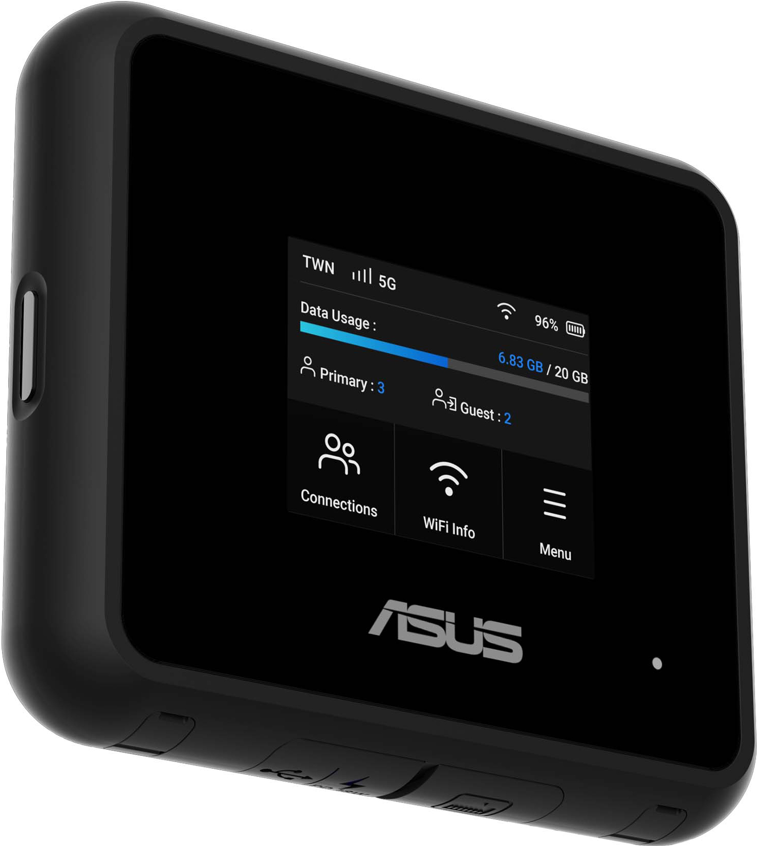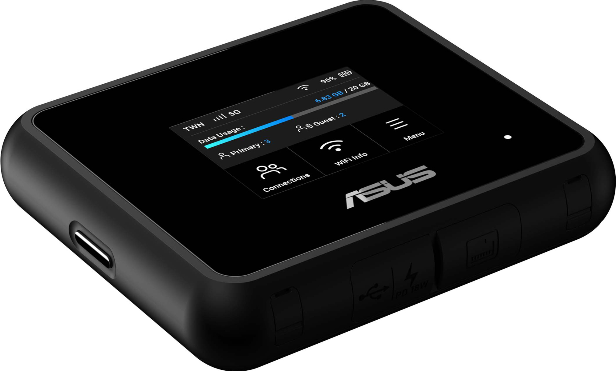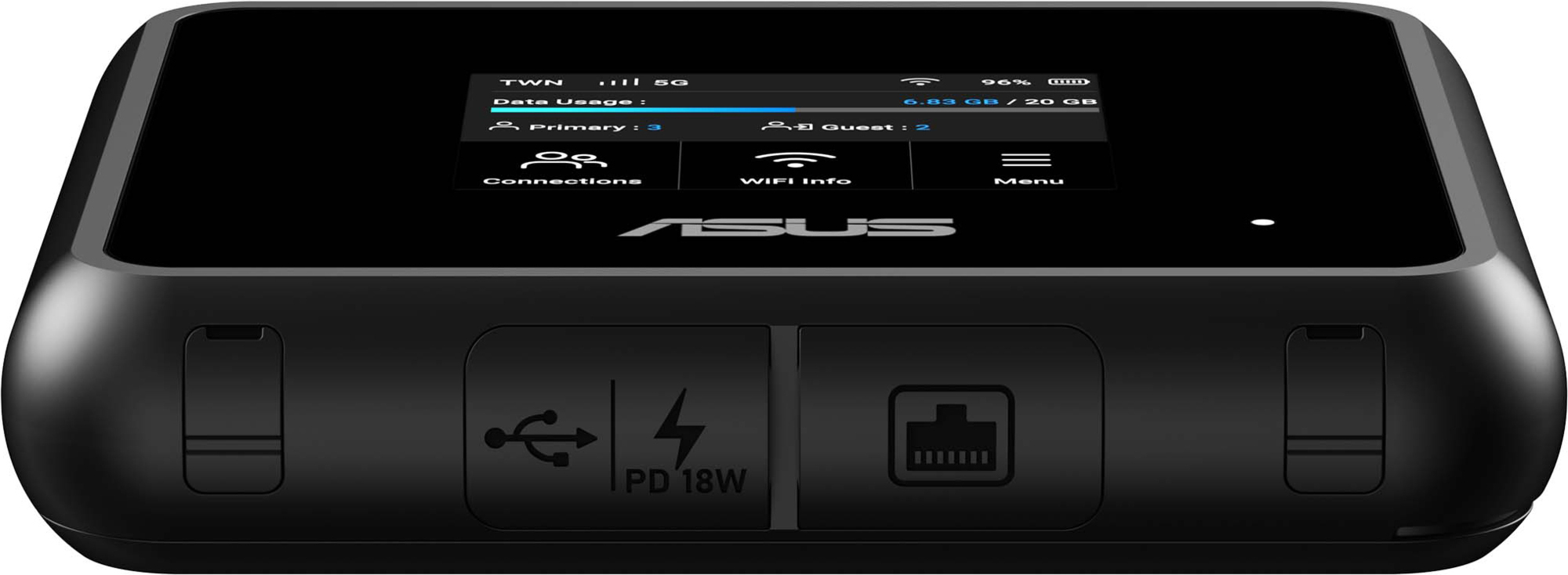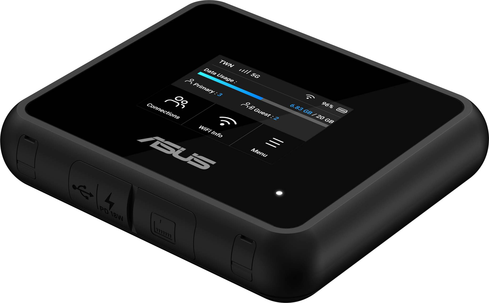 Denne Asus 5G GO WF7/BE5800 mobile bredbåndsrouter leverer 5G-forbindelse, tri-band WiFi 7 op til 6,5 Gbps, 2,5 G-port, USB-C-tethering og et batteri med 19 timers driftstid, alt sammen i et robust, rejseklar design med en 2,4" touchscreen.Læs mere om produktet
