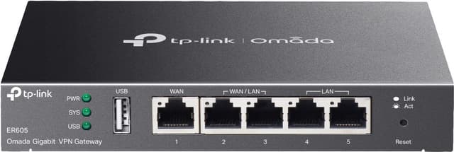 TP-link Omada ER605 VPN gateway routeren er designet til at tilbyde højhastighedsforbindelse via kabel og avancerede sikkerhedsfunktioner med mulighed for at understøtte flere VPN-protokoller og integrere med Omada SDN-controlleren. VPN-routeren har fem Gigabit-porte, understøtter op til 20 IPsec VPN-tunneler og tilbyder robust sikkerhed til netværksbeskyttelse og centraliseret cloud-styring.
