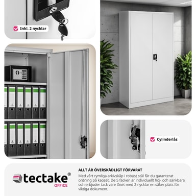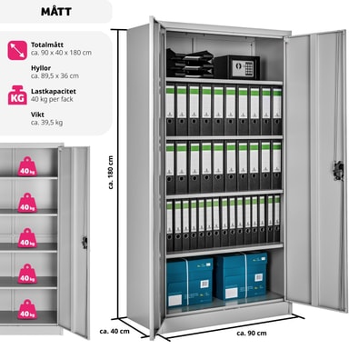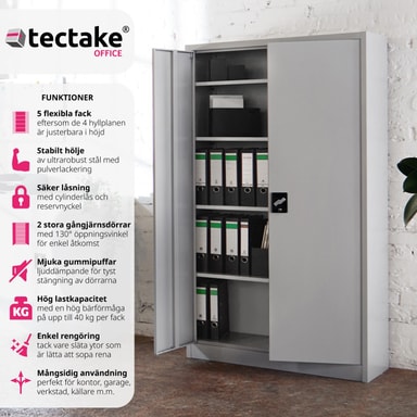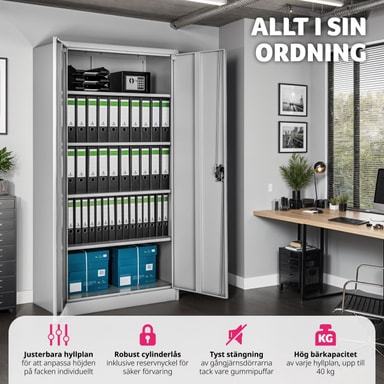 Få orden i opbevaringen af dine arkiver med et arkivskab, der kan låses. Således kan du opbevare arkiver og vigtige bilag på en sikker og overskuelig måde. Skabene er velegnede til forskellige formål: både i værkstedet, kontoret eller kælderen. De er kendetegnet ved en solid forarbejdning og en konstruktion i stålblik, der holder længe. De 4 hylder, der kan indstilles individuelt i højden, egner sig ideelt til opbevaring af mapper. Selve skabet og hylderne, der er forstærket med en kassestruktur, er holdt i en diskret farve, og er derfor et arkivskab, som er let at integrere i den øvrige indretning.