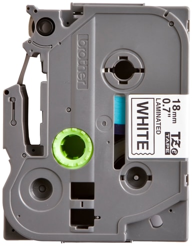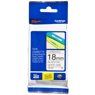 Lav hvide etiketter med sort tekst med din Brother labelmaskine ved hjælp af Brother TZe-241 etikettape-patron. Det laminerede tape er 18 mm bredt, 8 m langt og kan nemt påføres glatte overflader takket være klæbende bagside.