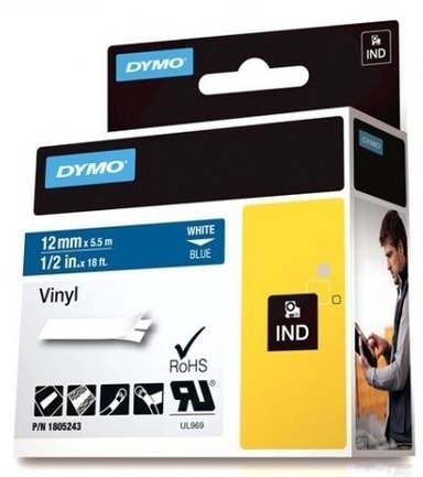 DYMO Rhino Professional, mærkbar permanent vinyltape, 12mm, hvid tekst på blå tape, 5,5mLæs mere om produktet