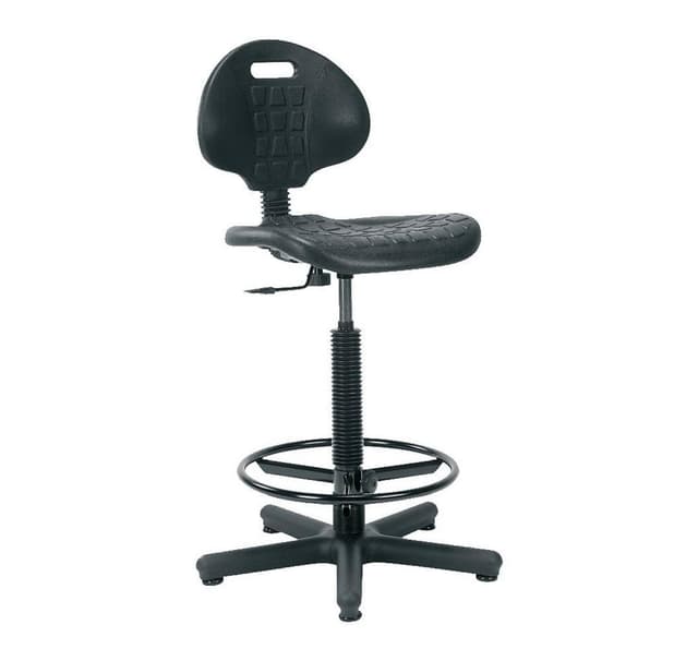 Høj arbejdsstol NARGO sort. Sæde og ryglæn er lavet af sort plast. Skridsikker sæde- og rygoverflade. Pneumatisk sædehøjdeindstilling, ryglænet kan justeres i højden. Sort stålstøtte til fødder, højdejustering med skrue. Bunden er lavet af sort plastik, D71cm. Stolehøjde 89-120cm, sædehøjde 55-80cm, sædedybde 44-47, sædebredde 46cm, højde på ryglæn 34-40cm. De overordnede mål er 71x71xH89-120cm. Vægtkapaciteten er 110 kg.