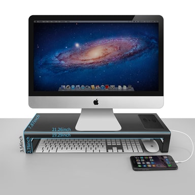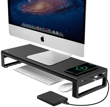 Hold dit skrivebord ryddeligt og forbedr din visning med dette skærmstativ. Det giver 4 USB 3.0‑porte til tilbehør og en Qi‑kompatibel trådløs ladeflade til din telefon.Læs mere om produktet