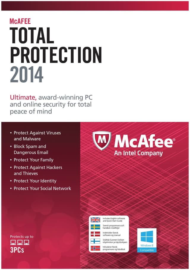 McAfee Total Protection 2014 giver dig kompleks beskyttelse på op til 3 computere i din husholdning. Den kraftfulde software blokerer og fjerner virus, malware og scanner din e-mail for spam, phishing og spyware, mens du samtidig får kontrol over onlinetrusler. McAfee Total Protection 2014 fylder ikke meget på din computer og kræver ikke mange system-ressourcer, så batterilevetiden på din bærbare computer forbliver høj.