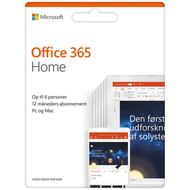 Microsoft Office 365 Home tilbyder komplicerede værktøjer til hele familien. Og med en generøse mængde cloud-lagring kan du arbejde med dine Office apps og files hvor som helst og når som helst.Læs mere om produktet