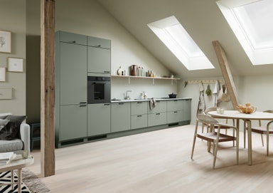 Epoq Trend Sage dækpanelvæg giver et klassisk design i en elegant, moderne grågrøn nuance til dit køkken. Sæt denne beroligende nuance sammen med lyst træ, børstet metal og cremefarver, og opnå et romantisk landligt look. I kombination med marmor og skinnende metaller skaber det et moderne og stilfuldt udseende. Det minimalistiske design og materialerne af høj kvalitet sikrer, at dit køkken vil bevare sin funktionalitet i årtier og ikke gå af mode.