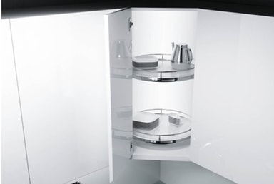 Hjørnekarrusel uden stolpe i midten til vægskab, der giver et fremragende overblik og nem adgang til de roterende hylder.Læs mere om produktet