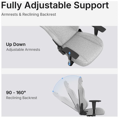Juster højden med klasse 4 stempler og hvilestolen giver en 90-160 graders hældning med vinkellås. Undgå muskelspændinger med 2D-armlænet og aflast håndledstrykket.