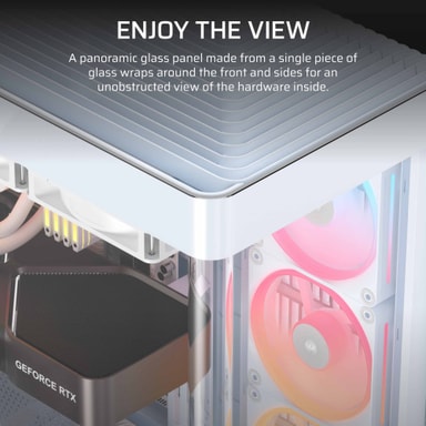 Corsair FRAME 4500X LX-R RGB Link Panoramic Glass PC-kabinettet leveres med et omsluttende glasdesign, der sætter dit build i fokus. Det understøtter effektiv køling med plads til to 360mm radiatorer og leveres med tre iCUE LINK RGB-blæsere.Læs mere om produktet