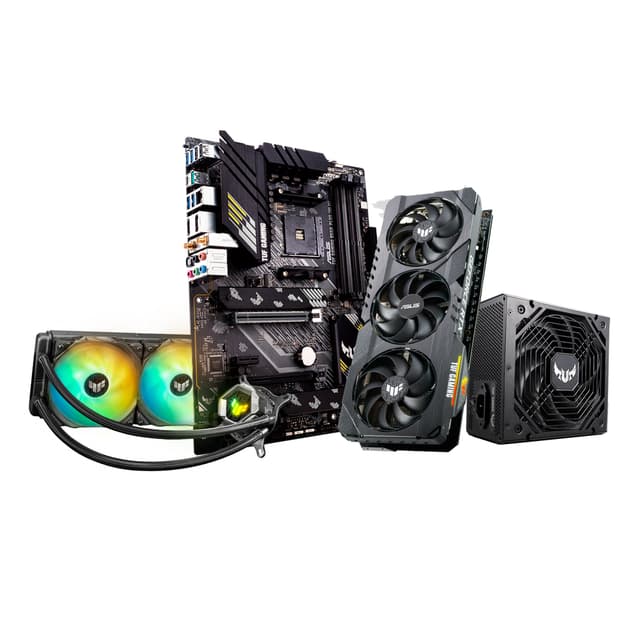 ASUS TUF Gaming GeForce RTX™ 3060 OC Edition 12GB GDDR6 buffed-up design with chart-topping thermal performance(TUF-RTX3060-O12G-GAMING) AMD B550 (Ryzen AM4) ATX gaming motherboard with PCIe 4.0, dual M.2, 10 DrMOS power stages, 2.5 Gb Ethernet, HDMI, DisplayPort, SATA 6 Gbps, USB 3.2 Gen 2 Type-A and Type-C, and Aura Sync RGB lighting support (TUF GAMING B550-PLUS) The ASUS TUF Gaming 650W Bronze PSU leads in durability(TUF-GAMING-650B) and TUF Gaming LC 240 RGB all-in-one liquid CPU cooler with Aura Sync, and dual TUF 120mm RGB radiator fans(TUF GAMING LC 240 RGB)