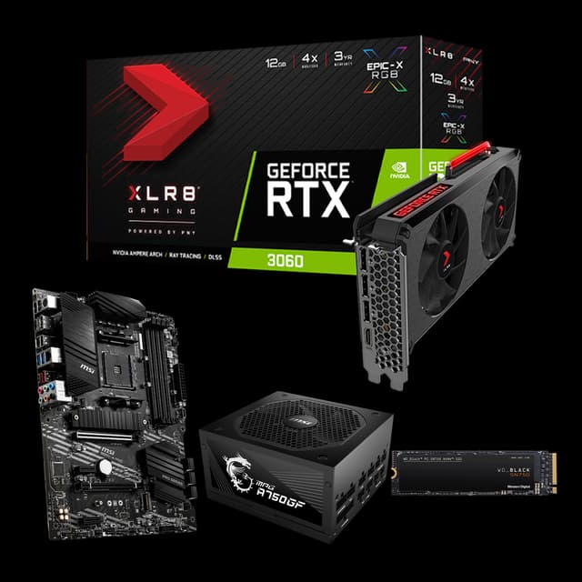 Package includes: PNY GF RTX3060 Uprising DF 12GB (VCG306012DFMPB), MSI B550-A PRO, MSI MPG A750GF, WD SN750 500GB (WDS500G3X0C)