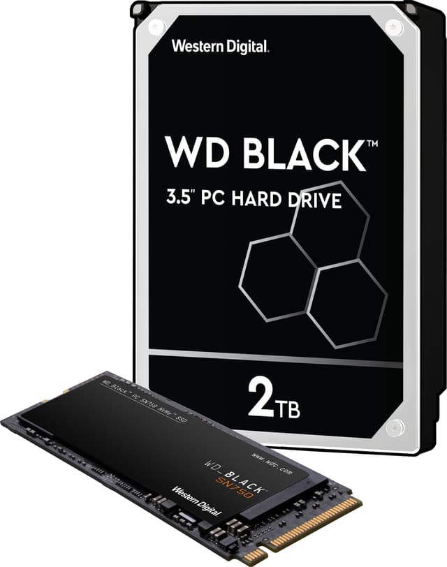 WD Black 3,5" 2 TB harddisk og WD Black SN750 500 GB NVMe SSD lagring