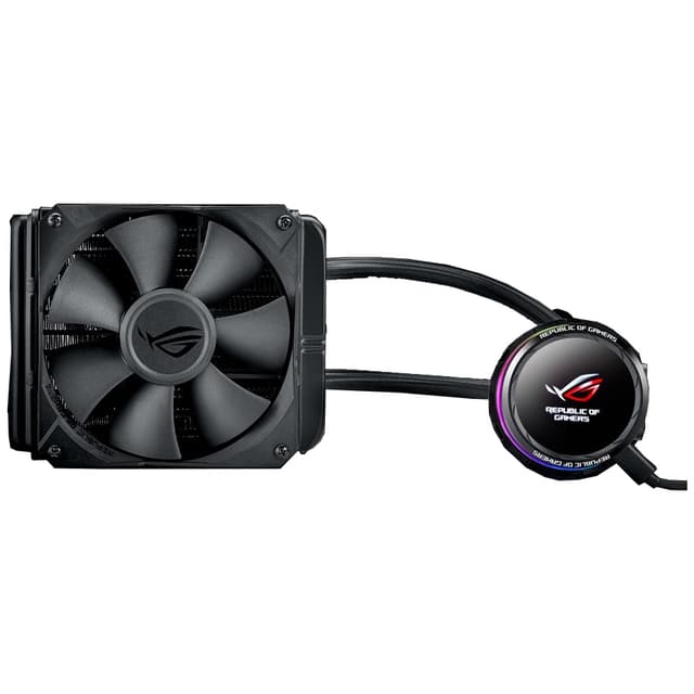 Asus ROG Ryuo liquid cooler features improved pump design that lets you run even high-performance Intel or AMD CPUs at overclocked speeds while maintaining safe operating temperature. The cooler features extra-thick 2.7 cm aluminium radiator with one 120 mm PWM fan for optimum cooling performance. The radiator-fan assembly fits into all standard 120 mm fan mounts. The closed loop design comes pre-filled and features improved cold plate with pre-applied thermal paste.