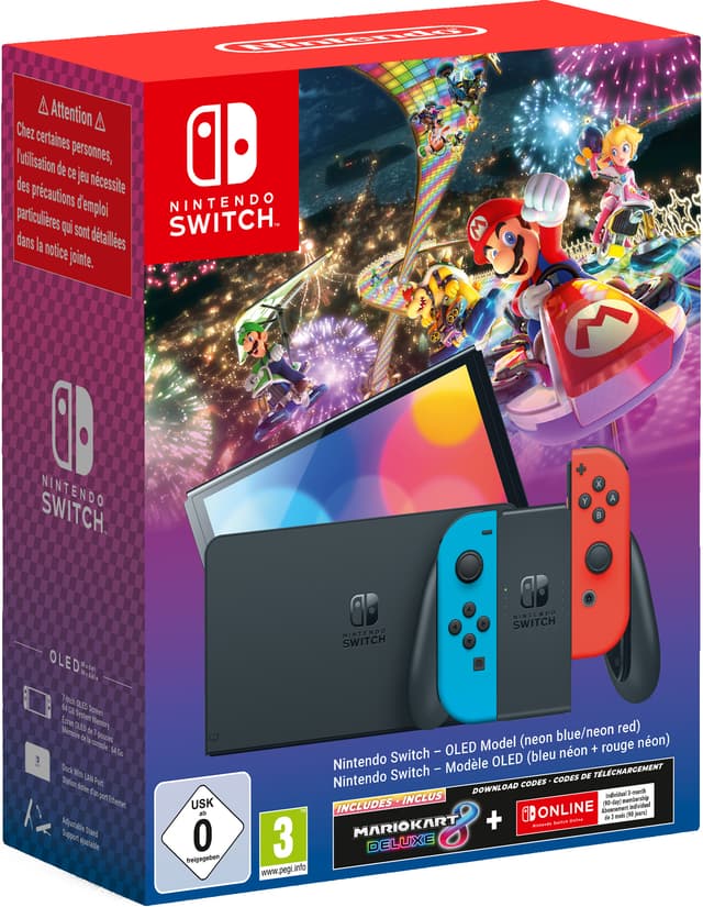 Nintendo Switch OLED leveres med en downloadkode til Mario Kart 8 Deluxe og en kode til et 3-måneders medlemskab af Nintendo Switch Online.