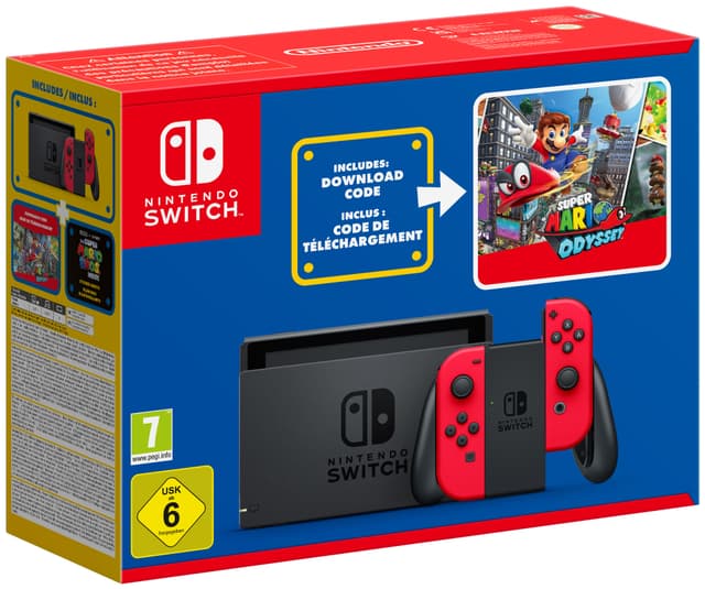 Tag med Mario og Cappy på deres utrolige 3D-eventyr i Super Mario Odyssey. Denne pakke inkluderer Nintendo Switch-konsollen med røde Joy-Con-controllere, en downloadkode til Super Mario Odyssey og klistermærker fra Super Mario Bros.-filmen.