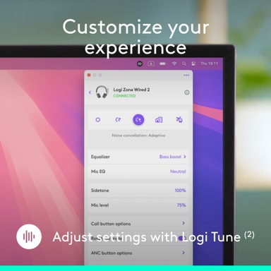 Logitech Zone Wired 2 bruger Logi Tune-appen til at give dig fuld kontrol over din lydoplevelse. Du kan finjustere 5-bånds equalizeren, justere sidetone for at høre din egen stemme og skifte mellem Adaptive ANC-tilstande, så de passer til dit hjemmemiljø.