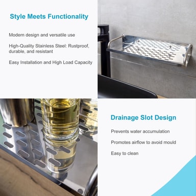 Den holdbare hylde er lavet af poleret rustfrit stål med kromlook og er hurtig og nem at rengøre. Drænhullerne forhindrer, at der samler sig vand på hylden.