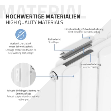 Radiatoren giver dig og din familie et sundt og behageligt liv! Selv om radiatorerne er designet til brug med en varmestang, er de stadig velegnede til tilslutning til centralvarmesystemet. Du finder det matchende monteringsmateriale i samme farve i leveringsomfanget.