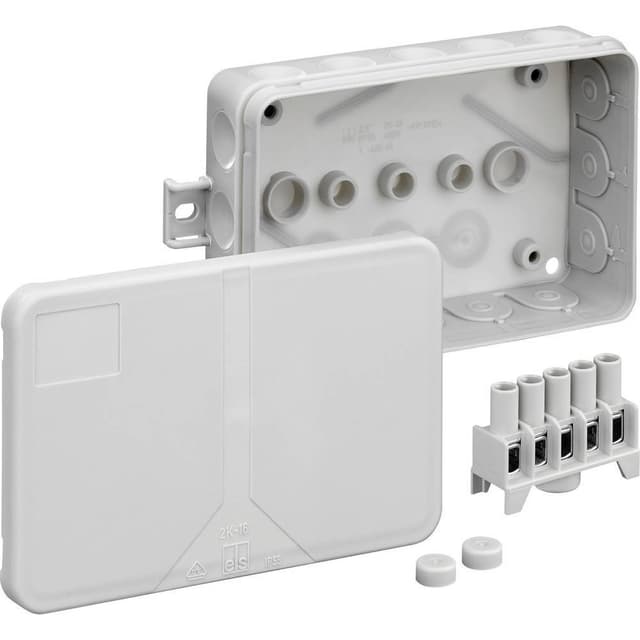 Tilslutningsdåse iht. din en 60670 (VDE 0606), 16 indgange og 3 indgange i bunden, med selvtættende, bløde indføringsmembraner, Værktøj til åbning af ledningsindføring ikke nødvendig, tætningsområde 2-14mm, med udvendige fastgørelsessteder, grå, med