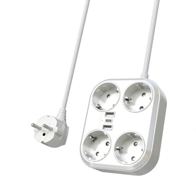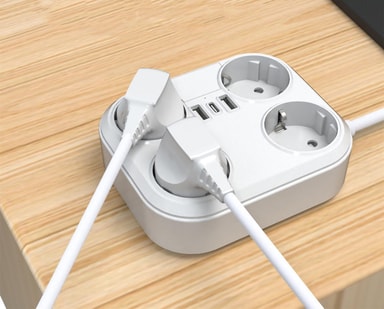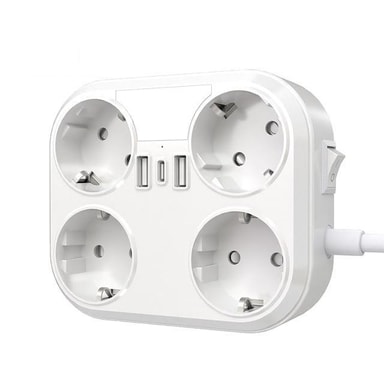 Stik med 4 AC-stik, 2 USB-porte og 1 USB-C-port, der kan bruges samtidigt uden at forstyrre hinanden. Længden af strømkablet giver dig mulighed for at placere den, hvor du vil.