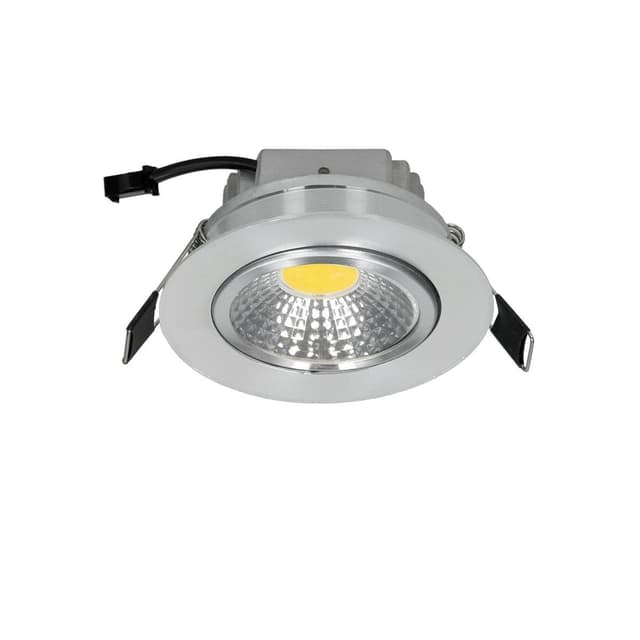 Teknisk information: LED COB 3W sølvramme: Lysstyrke: 180 lumen Strøm: 3W Type: LED COB Skæring: ca 70 - 75 mm Dybde: 45 mm Dimensioner lampen: Ø 80 mm Farve: Cool White Farve temperatur: 6000K Farve på ramme: Sølv Vinkel: 30 ° - 60 ° Materiale: Aluminium Energiklasse: A + Drift spænding: AC 220-240V / 50-60Hz Gennemsnitlig levetid: op til 50.000 timer Kan lysdæmpes: Nej