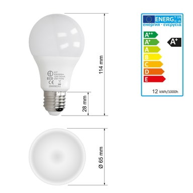 Teknisk information: Fabrikat / Model: E27 LED pære Energiklasse: A + Lysstyrke: 800 lumen Forbrug i watt: 12 watt Vinkel: 270 ° Livet i timer: 50.000 t .Farve: Varm hvid Driftstemperatur: -20 til 50 ° C Farve temperatur i Kelvin: 3000K - varm hvid Start tid: 1 sekunder Kan lysdæmpes: Nej Dimensioner: 114 mm x 65 mm Hydragyrum: 0 g Hg / kviksølv Strømforbrug: 12 kWh / 1000H Base: E27 Spænding: AC 220-240 Volt