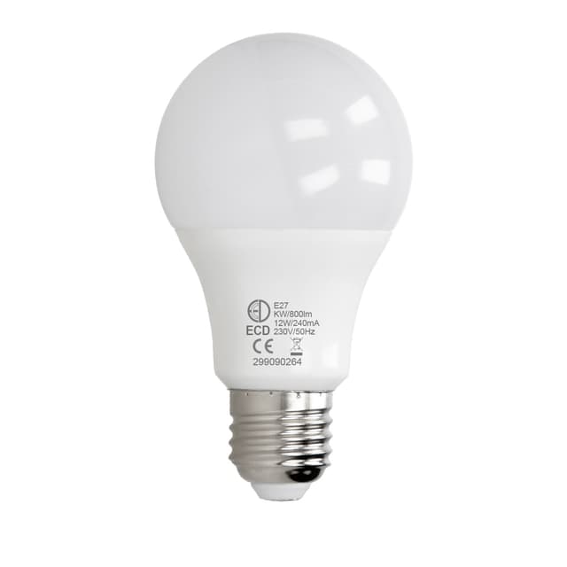 Teknisk information: Fabrikat / Model: E27 LED pære Energiklasse: A + Lysstyrke: 800 lumen Forbrug i watt: 12 watt Vinkel: 270 ° Livet i timer: 50.000 t .Farve: Cool White Driftstemperatur: -20 til 50 ° C Farve temperatur i Kelvin: 6000K - Cool White Start tid: 1 sekunder Kan lysdæmpes: Nej Dimensioner: 114 mm x 65 mm Hydragyrum: 0 g Hg / kviksølv Strømforbrug: 12 kWh / 1000H Base: E27 Spænding: AC 220-240 Volt